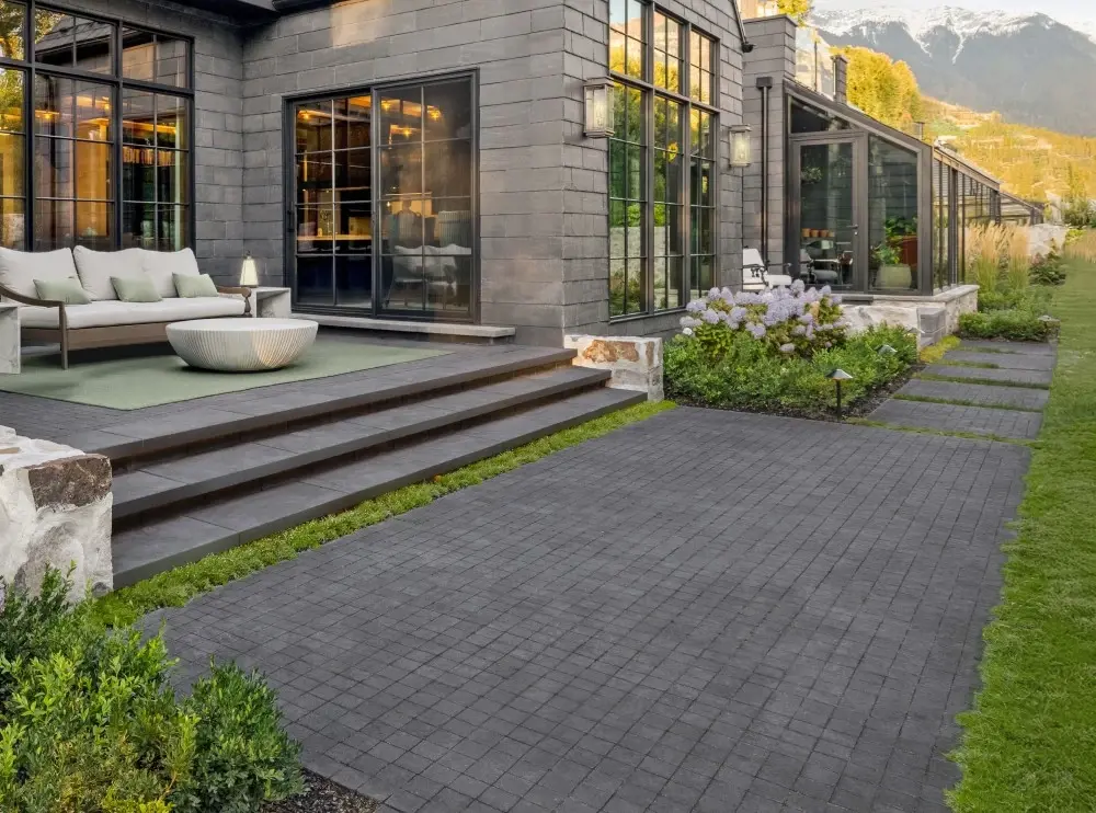 Squadra brings the charm of classic cobblestone into a modern, elevated expression. Its small, almost cubic format introduces texture and detail that stand out quietly—adding depth without overwhelming the space. Raffinato caps accentuate subtle elevation changes, guiding movement from walkways to raised seating areas and down into a sunken dining space. On the driveway, Westmount pavers are laid in an intricate mosaic pattern, creating a striking yet refined first impression. Used thoughtfully throughout the landscape, these elements create a finely woven, crafted feel that reflects the homeowners’ desire for something unique and personal. The result is a composition defined by subtle character, clean geometry, and a finish that feels intentional, balanced, and refined.