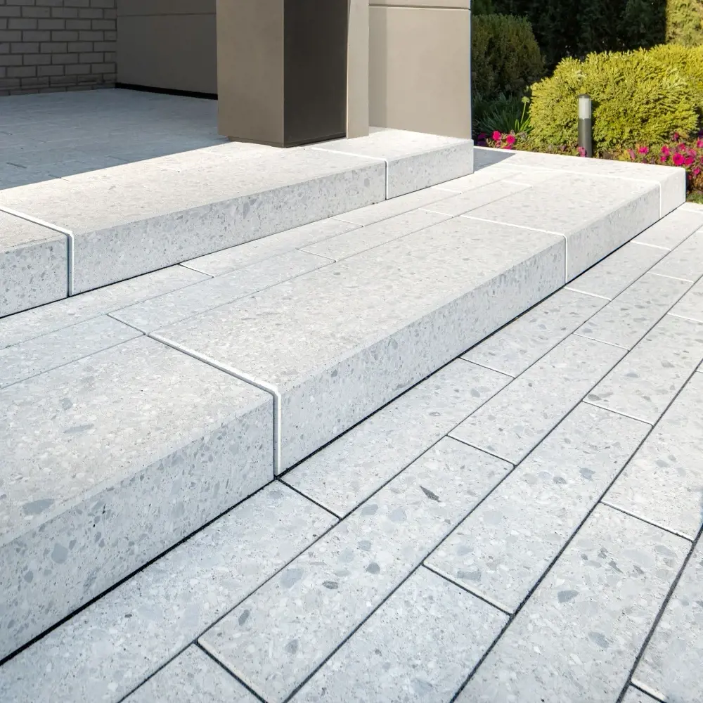 Movement through the property follows a clear architectural rhythm. The Terrazzo steps lead to the home’s entrance, framed by elegant arches that set a distinctly European tone and establish the material language for the rest of the design. Garden walkways branch out from the stairs, guiding guests toward the backyard along symmetrical, thoughtfully planted paths. The yard opens into a generous pool area laid in Terrazzo slabs, creating a bright, continuous surface that reflects both sunlight and landscape lighting. Nearby, a secondary lounge finished with Terrazzo slabs in a herringbone layout introduces a more intimate moment within the larger setting. The outdoor kitchen sits in its own defined zone finished in Mika, a darker paving surface that anchors the cooking area and distinguishes it from the surrounding spaces. The same Mika detailing carries through to the fireplace zone, tying the functional areas together without interrupting the visual flow.