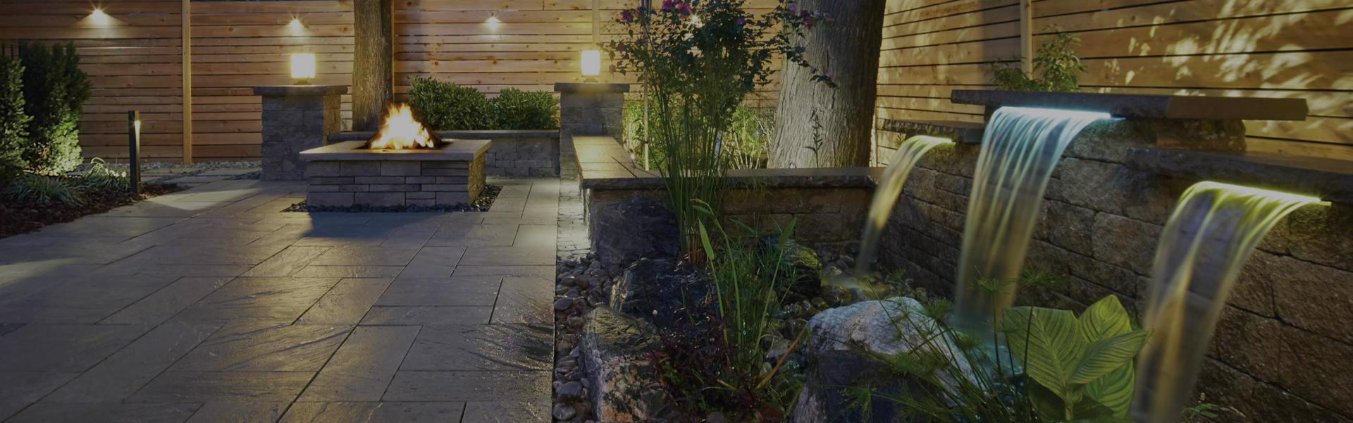 The design challenge was to create three distinct areas: a fire pit area, a seating area and an outdoor kitchen while keeping the flow seamless and the look harmonious. For the fire pit area and main walkways, Aberdeen slabs, chosen for their luxurious natural slate look, were installed in a modular pattern to pave the main area and connect the spaces.