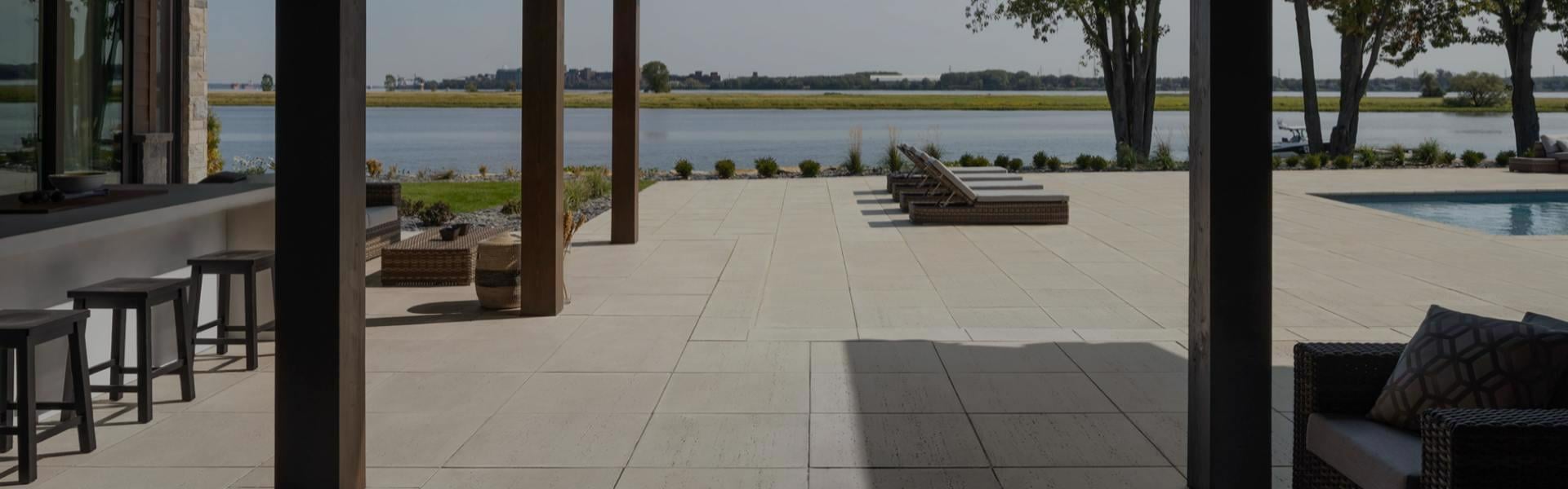 From the spectacular view this backyard boasts, to finding the perfect lounge chairs to create the ultimate resort experience, this poolside was designed for the ultimate relaxation. By positioning their swimming pool close to the water, this allows the homeowners to feel as if they’re swimming in a natural environment. The Travertina collection can be seen throughout the project. From the step treads, patio and pool coping, this versatile series created a clean and seamless design. The integration of the rustic lounge chairs and natural texture of the Travertina slabs creates the perfect combination that brings forth a resort like feel to their backyard.