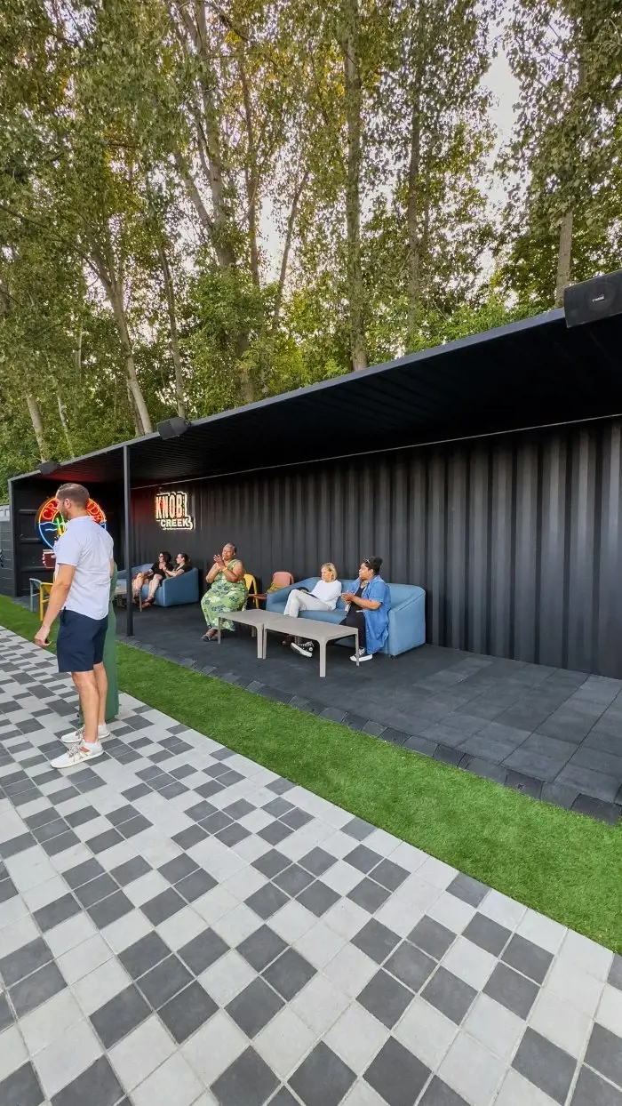Des conteneurs maritimes transformés en bar, scène et zone de jeux structurent l’espace, tandis que les pavés épurés Industria de Techo-Bloc l’ancrent avec style et solidité. Autour, pelouses synthétiques, foyers, voiles d’ombrage et jeux de lumières composent une mosaïque de zones pour se détendre, manger et s’amuser.